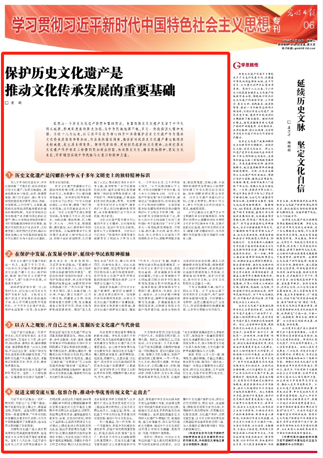 历史文化遗产不仅属于我们这一代人,也属于子孙万代。习近平总书记每次考察调研历史文化遗产都十分关心保护问题,强调“保护历史文化遗产责任重大”,要“在保护中发展,在发展中保护”。